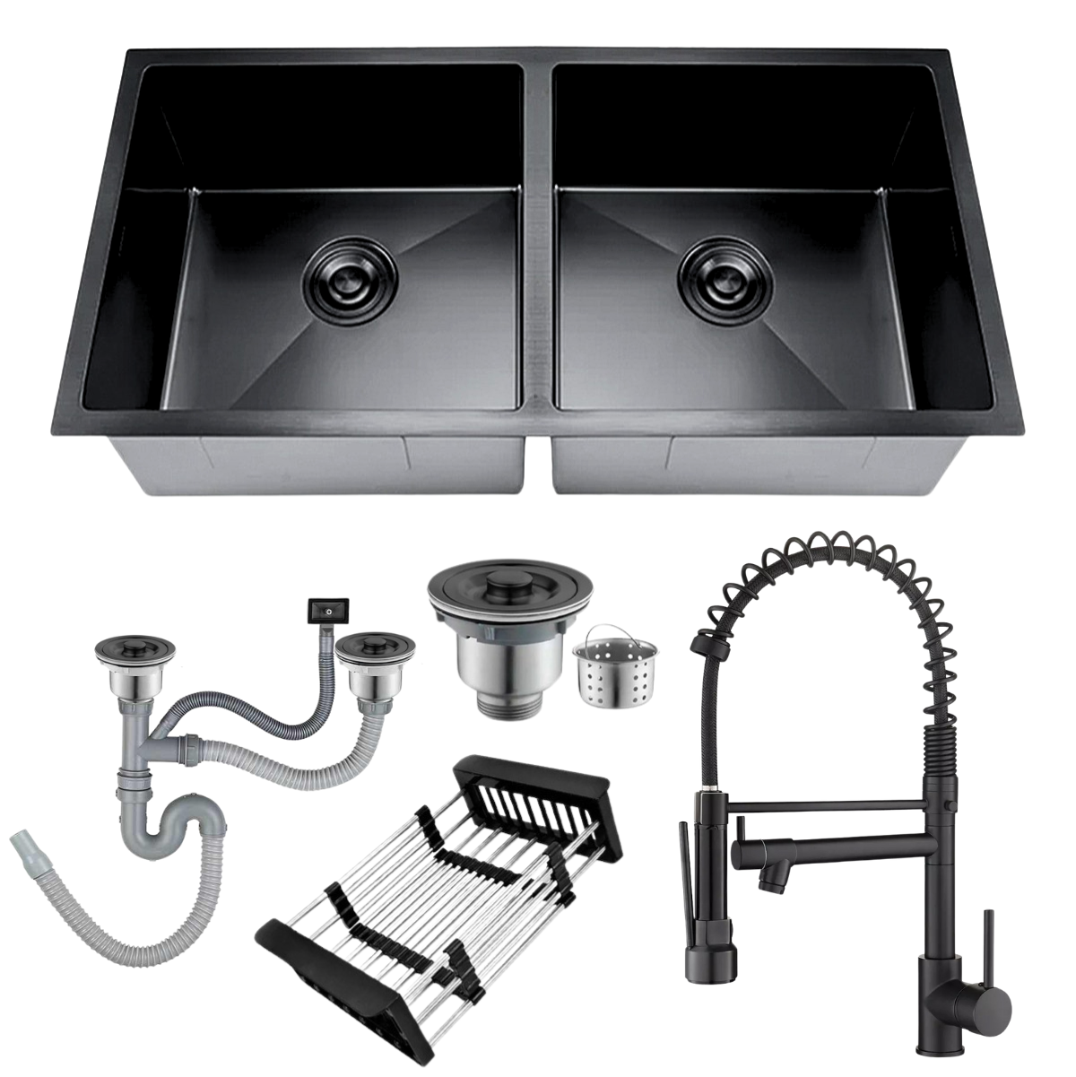 -Cuba Dupla Inox Cor Preta Quadrada Cozinha Pia Gourmet 75x41 -Torneira De Cozinha Pia Gourmet Monocomando Cor Preta Inox 304