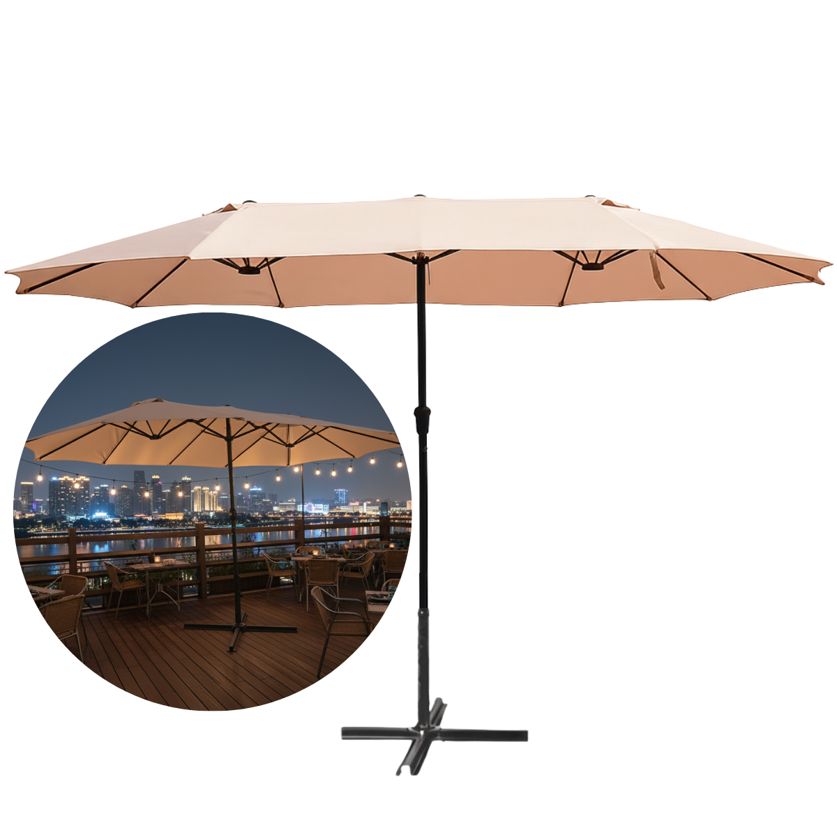 Este ombrelone duplo oferece cobertura excepcionalmente ampla e eficiente, ideal para grandes pátios, decks à beira da piscina e espaços comerciais. Seu design inovador e moderno garante sombra contínua e circulação de ar ininterrupta, proporcionando um conforto inigualável. Com um estilo arquitetônico marcante, é a solução perfeita para proteção solar funcional e esteticamente agradável.